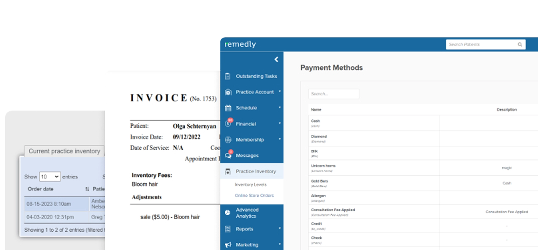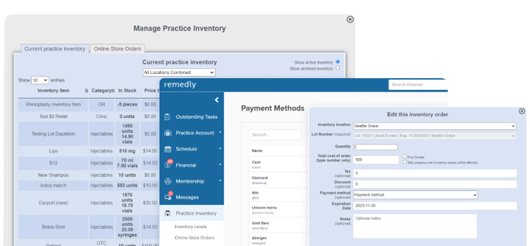 Knowledge is power, and, when it comes to inventory management, it also impacts profit. Our medical office software maximizes your potential by optimizing efficiency. The software will warn you when stock levels of any item are low and crucially for any medical practice, you will receive warnings when items are approaching their expiration date. So much waste in our industry comes from expired products, it is avoidable with Remedly’s inventory management function. Inventory management - Be in control of stock by knowing what’s on your shelves at any given time, tracking inventory status (expiration dates, stock levels etc) and ordering the right amount to optimize sales, from any device. Manage supplements, skincare products, or any over-the-counter products alongside injectables and disposablesKnowledge is power, and, when it comes to inventory management, it also impacts profit. Our medical office software maximizes your potential by optimizing efficiency. The software will warn you when stock levels of any item are low and crucially for any medical practice, you will receive warnings when items are approaching their expiration date. So much waste in our industry comes from expired products, it is avoidable with Remedly’s inventory management function. Inventory management - Be in control of stock by knowing what’s on your shelves at any given time, tracking inventory status (expiration dates, stock levels etc) and ordering the right amount to optimize sales, from any device. Manage supplements, skincare products, or any over-the-counter products alongside injectables and disposables